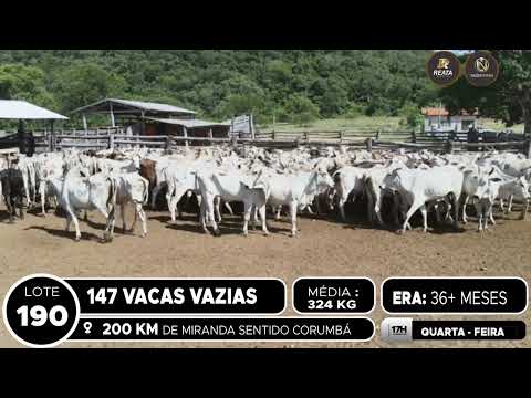 LOCALIZAÇÃO: 200 KM DE MIRANDA SENTIDO CORUMBÁ DESCRIÇÃO DO LOTE: 147 VACAS NELORE E CRUZADAS, VAZIAS, COM DIAGNÓSTICO, GADO SADIO E DE BOA CONFORMAÇÃO. ACESSO A CARRETA ALTA