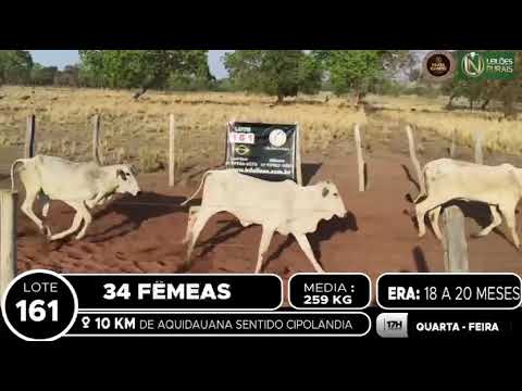 LOCALIZAÇÃO: 10 KM DE AQUIDAUANA SENTIDO CIPOLÂNDIA DESCRIÇÃO DO LOTE: 34 FÊMEAS NELORES DE 18 A 20 MESES, SADIAS, DE BOA CONFORMAÇÃO, BOM RACIAL, COM GANHO COMPENSATÓRIO. PESADAS NO PERÍODO DA MANHÃ. ACESSO A CARRETA ALTA.