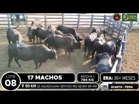 LOCALIZAÇÃO: 90 KM DE AQUIDAUANA SENTIDO BR 419 DESCRIÇÃO DO LOTE: 17 MACHOS BRANGUS ACIMA DE 36 MESES,TODOS INTEIROS,SADIOS,BOM RACIAL,DE BOA CONFORMAÇÃO.PESADOS NO PERÍODO DA TARDE.ACESSO A CARRETA ALTA.