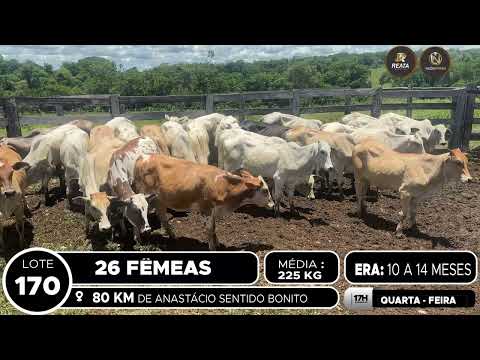 LOCALIZAÇÃO: 80 KM DE ANASTÁCIO SENTIDO BONITO DESCRIÇÃO DO LOTE: 26 FÊMEAS DE 10/14 MESES, CONTÉM 10 ANELORADAS NO LOTE, SADIAS, DE BOA CONFORMAÇÃO, COM GANHO COMPENSATÓRIO. PESADAS NO PERÍODO DA MANHÃ. ACESSO A CARRETA ALTA.