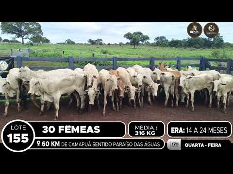 LOCALIZAÇÃO: 80KM DE CAMPO GRANDE SENTIDO CACHOEIRÃO DESCRIÇÃO DO LOTE: 35 FÊMEAS NELORE E ANELORADAS DE 24 A 36 MESES. SADIAS, COM BOM COMPENSATÓRIO, LOTE HOMOGÊNEO. ESTAVAM COM TOURO, MAS NÃO FOI FEITO O DG. PESADAS NA BALANÇA ELETRONICA , NO PERIODO DA MANHÃ. ACESSO A CARRETA ALTA.