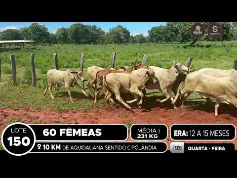 LOCALIZAÇÃO: 10 KM DE AQUIDAUANA SENTIDO CIPOLÂNDIA DESCRIÇÃO DO LOTE: 60 FÊMEAS NELORE DE 12 A 15 MESES, GADO SADIO E DE BOA CONFORMAÇÃO. ACESSO A CARRETA ALTA